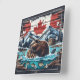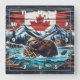 Um castor canadense constrói uma barragem em um rio sereno, cercado por montanhas e árvores verdes, com pano de fundo de bandeira canadense.