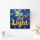 This image presents a vivid, heavily textured artwork with the uplifting phrase "Be the Light" in bold, raised golden-yellow lettering. The background is a rich, deep blue, rendered with expressive, thick brushstrokes that create a swirling, cloud-like or celestial effect, accented with small yellow specks resembling stars. The biblical reference "Matthew 5:14" is included in yellow text in the upper right corner. The overall aesthetic is one of profound spiritual inspiration, resembling a modern impasto painting with a luminous quality.