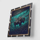 Esta ilustração apresenta um fundo de couro néon colorido escuro e com um bisão estilizado num campo. Uma cordilheira é visível atrás dela, toda feita em tons de choro e azul escuro. A textura gravada dá ao trabalho de arte uma aparência única e marcante, enfatizando os contornos da paisagem e do bisão.