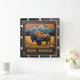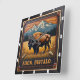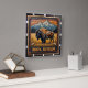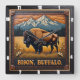 Esta ilustração é uma homenagem ao Ocidente Americano, com uma bisão estilizada num campo de erva. O fundo apresenta uma montanha sob um pôr do sol vibrante. O trabalho de arte é dotado de uma textura de couro com ferramentas distintivas e uma borda decorativa. As palavras "BISON, BUFFALO" estão no fundo.