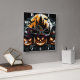 Três abóboras entalhadas com grinos estranhos brilham intensamente contra um céu crepúsculo, emolduradas por morcegos e um castelo assombrado banhado à luz da lua.