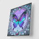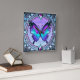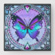 Uma borboleta vibrante com tons de azul e roxo é centrada dentro de um design circular ornamentado, cercada por intrincados padrões florais e joias decorativas. A composição total expele uma estética de vidro manchado com uma mistura harmoniosa de cores e simetria.