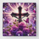 Esse relógio de parede quadrada mesmerizante apresenta uma cruz silenciada banhada em vibrantes raios de luz roxos e rosa. As rosas roxas esmagadas florescem em sua base, enquanto as delicadas borboletas roxas e rosa flutuam ao redor, criando uma tela mística e espiritualmente encantadora. Esta design funde a fé com um toque de fantasia.