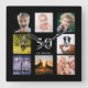 Um relógio de parede como presente para um aniversário de 50 anos (ou qualquer idade) para uma cara, celebrando sua vida com uma colagem de 8 fotos suas. Personalize e adicione 50 anos, e uma data. Data de nascimento ou data do aniversário. Letras brancas coloridas. Fundo preto.
