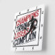 Este relógio branco apresenta a palavra "CHAMPIONS" em uma fonte vermelha em negrito no topo, seguida de "TRAIN USERS" também em vermelho, mas ligeiramente menor. Abaixo, "COMPLAIN" é exibido em uma fonte vermelha maior e mais escura. À direita, há um gráfico de um jogador de basquete, que parece ser negro, driblando uma bola. O design é esportivo e assertivo.
