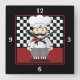 Este velho relógio do mundo tem um chef francês gordinho vestindo um cachecol vermelho, chapéu branco de chef, calças listradas vermelhas e brancas e avental preto porque ele está pronto para cozinhar e pronto para decorar sua cozinha.