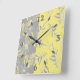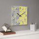 Relógio Quadrado Cinzas e folhas amarelas sobre fundo listrado.