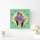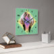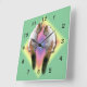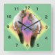 Long haired calico cat viewing it's mirrored image, standing in front of a diamond shape in pastel rainbow colors. Cat is mostly white with browns, and black patterned fur. Black numerals.