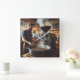 Um close-up das mãos em um avental vestido cuidadosamente adicionando uma colher de grãos de café marrom ricos em uma máquina de torrefação de café vintage. O vapor ou a fumaça sobem graciosamente da máquina, apontando para o processo de assagem aromático no interior. O cenário industrial, porém convidativo, apresenta uma parede de tijolos rústica e iluminação quente, lembrando um confortável compro de café ou assalto. Prateleiras cheias de itens relacionados ao café acrescentam ao autêntico ambiente de café.