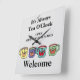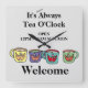 Você pode mudar as palavras, as cores. As quatro canecas com sorrisos felizes podem mudar de cor, apenas brincar ao redor e escolher sua cor favorita. O texto também pode ser mudado instantaneamente por você. Sem custo extra. Você mesmo faz isso e tem uma prévia instantânea, toca com as cores, adiciona cor de fundo e muito mais. Texto na poster agora: "É sempre Tea O'Clock", horário de abertura e boas-vindas.