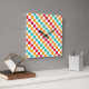 Alternating red, orange, teal, and white squares create a colorful, vibrant checkerboard pattern, conveying an energetic and playful tone.