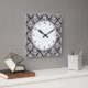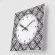 Este relógio de parede apresenta uma cor damasco floral branca sobre um fundo preto.