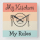 A casa engraçada bate a parede da cozinha com a diversão de minhas regras dizendo em um padrão de listras coloridas de fundo em tons de pêssego e verde. Projetado como um presente humorístico para a cozinha ou sala de jantar.