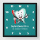 Um relógio personalizado com uma ilustração de um estilo de desenho animado, um grande dente branco sorrindo alegremente segurando uma escova de dente vermelha e dando aos polegares um sinal.