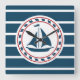 design náutico com decoração de embarcações à vela em forma redonda, em fundo listrado a azul e a branco