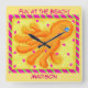 Decorar uma sala com um tema de praia com esse relógio personalizado de parede, cor de laranja e nome amarelo. Esta arte é excelente tanto para crianças quanto para adultos em um estilo de arte caprichosa. O polvo branco é laranja e está num fundo de textura amarela e rodeado de corações rosa-quentes. O design é emoldurado por uma fúchsia rosa quente e uma borda de verde limão. Isto faz um presente de excelente e é excelente para uma casa de praia. Isso é criado com a arte original de Phyllis Dobbs e é vibrante nas cores amarela, laranja e rosa quente. Totalmente personalizável para seu prazer.