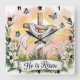 Este inspirador relógio de parede quadrado apresenta uma cruz de madeira enrolado com um pano branco, colocado contra um sol radiante e rodeado por lírios brancos vibrantes e delicadas borboletas azuis. Uma faixa com "Ele é Risen" em uma escrita elegante completa essa descrição serena e esperançosa de Páscoa e ressurreição.