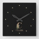 Relógio de parede preta elegante com monograma botânico dourado e nome personalizado.