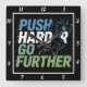 Este relógio de parede preta apresenta o texto motivacional "PUSH HARDER GO FAITHER" empilhado verticalmente em uma fonte em negrito, ligeiramente angustiada, com gradientes de cor azul e verde. Uma silhueta de um corredor, que parece ser um indivíduo de pele clara, em movimento é colocada à direita do texto, transmitindo velocidade e progresso. A design encoraja a perseverança na consecução dos objetivos.