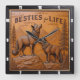 This square wall clock features a highly detailed, dimensional illustration of two wolves standing on a rocky outcrop. The entire design is rendered in warm monochrome brown and orange tones, strongly suggesting an Engraved Wood Look or carved relief. The wolves are rendered with detailed texture emphasizing their fur, with one looking upward and the other looking down toward the center. They are positioned against a backdrop of stylized pine trees and mountain peaks. The large, three-dimensional embossed text "BESTIES for LIFE" is carved across the upper sky area. The clock face features a simple clock face border with large, white, numbered tick marks (1 to 12). The artwork is surrounded by a dark, textured decorative border that resembles a black wood frame.