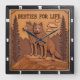 This square wall clock features a highly detailed, dimensional illustration of two wolves standing close together on a rocky ledge. The entire design is rendered in a mix of warm browns, deep chocolate, and tan tones, strongly suggesting an Engraved Wood Look or carved relief. The wolves are rendered with detailed texture emphasizing their fur. They are positioned against a backdrop of stylized dark brown pine trees and textured mountain ridges. The large, three-dimensional embossed text "BESTIES FOR LIFE" is carved across the upper sky area. The clock face features a simple clock face border with large, white, numbered tick marks (1 to 12) integrated into the decorative frame. The artwork is surrounded by a dark, textured decorative border that resembles a black wood frame.