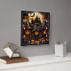 Três espantalhos reluzentes ficam debaixo de uma lua de cheio, cercados por abóboras brilhantes e um castelo assombrado, criando uma atmosfera arrepiante perfeita para o Dia das Bruxas.