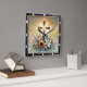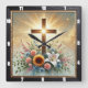 Este impressionante relógio de parede quadrada apresenta uma cruz de madeira brilhante, emitindo raios de luz divina contra um céu radiante. A base é enfeitada com uma enxurrada de flores vibrantes, incluindo um lírio branco proeminente, girassol e várias flores cor-de-rosa e azul, simbolizando fé, esperança e beleza natural.