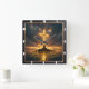 This incredibly moving and majestic design powerfully captures the central message of the Eternal Promise—salvation through belief. The artwork features a magnificent, golden Cross glowing brightly on a rocky island at sunset, dramatically reflected in a calm expanse of water. This powerful imagery symbolizes the firm foundation of faith. A prominent clock motif with dark hands overlays the scene, reminding the observer that God's love is timeless and everlasting. The design is presented with a high-quality, durable print that creates the striking illusion of a rich, dark wood grain frame surrounding the image, though this border is entirely a visual effect printed directly onto the clock face and is not a separate frame or real wood. The full text of the Christian message, "For God so loved the world, that he gave his only begotten Son, that whosoever believeth in him should not perish, but have eternal life. John 3:16." is inscribed on the image, making it an ultimate statement of belief.