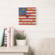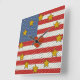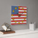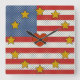 O relógio da parede divertida mostra o design patriótico delicioso de Leslie Sigal Javorek baseado na bandeira americana: com listras poka-pontilhadas alternadas de vermelho e branco; um bloco azul pontilhado por polca no canto superior esquerdo; estrelas coloridas de mostarda picante como marcadores de hora, e um coração vermelho sujo no centro. Escolha o estilo quadrado ou redondo.