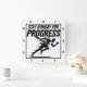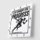 Este relógio branco apresenta o texto motivacional "STAY HUNGRY FOR PROGRESS" em uma fonte preta e em negrito. Abaixo do texto está um gráfico dinâmico preto e branco de um corredor, que parece ser um indivíduo de pele clara, em cheio estriado com linhas de velocidade indicando movimento. O design encoraja uma mentalidade de melhoria contínua e impulso.