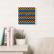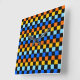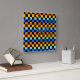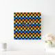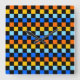 A vibrant checkerboard pattern featuring alternating rows of orange, yellow, light blue, and blue squares against a black background. The design is bold and energetic.