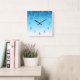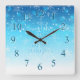 O Relógio de Parede Quadrada de Snowflakes é uma forma de adicionar design sazonal ao seu presente com uma mensagem personalizável, uma vez que cada palavra é individualmente intercambiável "Flocos de neve são borboletas de inverno". A cor dominante é azul e branca.
