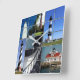 Todos os Faróis de Bancos Exteriores do norte: Da Luz Currituck em Corolla (farol de tijolos vermelhos, no meio da design), a seguir a Sul, o Farol da Ilha de Bodie, na Cabeça do Alto Sul (o farol preto e branco, preto horizontal/plano, no alto, à direita da design), a seguir, o Farol de Roanoke Marshes, em Manteo, na Ilha de Roanoke, o belo e histórico farol de Cape Hatteras Ela está em Frisco na Ilha de Hatteras e, por último, cruza a balsa para a Ilha de Ocracoke pela Luz de Ocracoke. As escadas são dentro do farol da Ilha Bodie. Eu mesma tirei todas as fotos enquanto visitava cada um dos faróis.