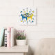 Este relógio de parede tem uma design de arte folclórica sueca de Dala Horse em cores azuis e amarelas da Suecia. Há também flores de arte folclórica correspondentes na mesma cor. Você pode fazer o padrão de fundo neste relógio pequeno ou maior.