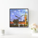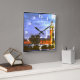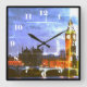 Este relógio é decorado com uma fotografia cor angustiada do Big Ben e das Casas do Parlamento em Londres, à noite. o relógio é quadrado e tem números.