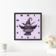 Um relógio com uma ilustração temática divertida do Dia das Bruxas para amantes de gatos. Um gato preto de olhos grandes vestindo um chapéu de bruxa preta grande com um cinturão roxo rosa ao redor da borda.