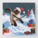Relógio Quadrado Gato Siamês Correndo em Neve com Chapéu de Natal