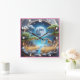 Uma girafa serena esmove-se perto de uma fonte de água tranquila, iluminada pela lua. As árvores exuberantes enquadram a cena, enquanto os pássaros sobem graciosamente no céu suave da noite.
