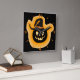 Square Wall Art Clock and home furnishing decor accessory with Glowing Pumpkin Witch with black background and artwork design image by TheFabricSeal at Zazzle with a blackened black silhouette of a creepy looking witchy pumpkin wearing a witch’s pointed conical crown hat and buckle strap with a flaming fiery white hot golden orange fire glow behind it in the background and through the carved out pumpkin eyes, nose and mouth.