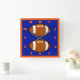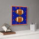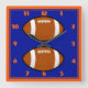 Um Futebol brilhante e colorido que está num Relógio de Parede Quadrado. Tem um fundo azul brilhante e colorido.