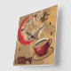 imagem de uma xícara de café, mancha de anel de café e grãos de café. O teste diz: Hora do Café.