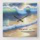 Relógio de parede apresentando uma pintura pacífica de uma onda na praia ao sol. Um design sonhador e pacífico.