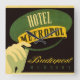 Ilustração da Vintage: etiqueta europeia de poster de viagens ou bagagem do Hotel Metropol, Budapeste, Hungria. Uma mão com uma luva branca formal segurando um chapéu ou boné de bellhop verde e amarelo.