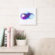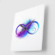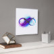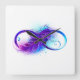 Símbolo infinito com uma bela pena pintada em cores roxas e azuis brilhantes sobre fundo branco.