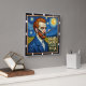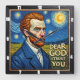This image presents a striking artwork in the distinctive style , featuring a portrait of a man with fiery red hair and beard, and piercing blue eyes, reminiscent of Van Gogh himself. He is dressed in a dark blue coat over a collared shirt. The background is a vibrant, textured night sky filled with swirling stars and a crescent moon, above a golden, impressionistic field. Prominently displayed in the lower right corner, bold text reads "DEAR GOD I TRUST YOU." The piece combines iconic artistic style with a profound message of faith.