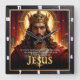 This powerful and majestic design captures the theme of Jesus as the King of Kings and Lord of lords. The artwork, featured on a square wall clock, displays a central, compelling image of Christ's face beneath a richly detailed golden crown, highlighted by a prominent blue jewel. He is draped in a brilliant red robe and framed by a glowing golden arch and radiant light, emphasizing his divine authority. The bold word "JESUS" is prominent at the bottom, directly beneath the powerful biblical quote from 1 Timothy 6:15: "He who is the blessed and only Sovereign, the King of kings and Lord of lords." This incredible image is a spectacular tribute to faith and devotion, serving as an inspiring piece of religious decor and a striking centerpiece for any faithful home or sacred space.