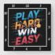 Este relógio de parede preta apresenta o texto "REPRODUZIR DURO WIN EASY" empilhado em letras a negrito, ligeiramente angustiado com gradientes de cor: azul para "REPRODUZIR", laranja para "DURO", branco para "WIN" e vermelho para "EASY". Uma bola de basquete estilizada é incorporada à palavra "DURO". Linhas de velocidade horizontais destacam o texto, transmitindo energia e movimento. A design é temática desportiva e motivacional.