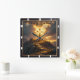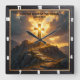 This powerful and evocative design captures the theme of the Light of Salvation—the divine path and guidance offered through Christ. The artwork, featured on a square wall clock, displays a brilliant, glowing golden cross standing monumentally atop a rugged mountain summit. A clear stone pathway or stairway ascends the mountain directly toward the cross, symbolizing the journey of faith. The cross is bathed in intense light and dramatic sunrays that pierce the surrounding clouds, representing the light of the world. The core message of Christian faith is quoted from John 8:12: "I am the light of the world". This incredible image provides a spectacular visual representation of faith, serving as an inspiring timepiece and striking centerpiece for any faithful home or office, symbolizing hope and eternal direction.