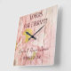Um adorável relógio romântico faz um presente memorável para um casal. De recém-casados a casais em seus ouros anos, este design apresenta um adorável fundo floral rosa com fonte burgundy complementar. Use a modelo para preencher suas informações pessoais. Faça esse relógio seu hoje! Arte: moradia