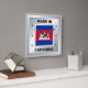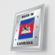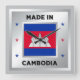 The national flag of Cambodia is central to the design. There are decorative stars on either side of the flag, and they are in the colours of the Cambodian flag. The design is completed by a faux silver background.